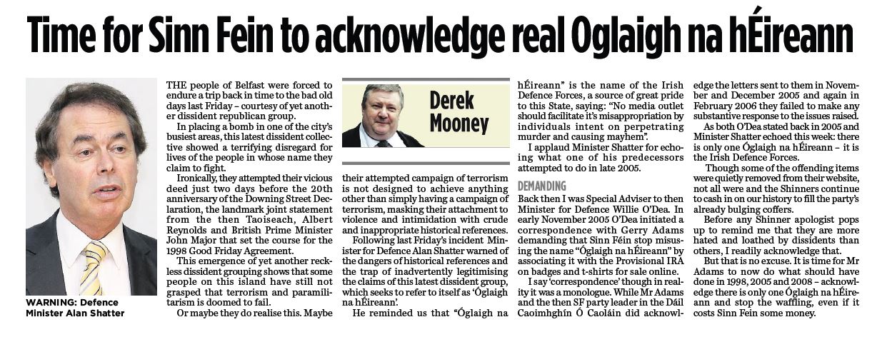 Back then I was Special Adviser to then Minister for Defence Willie O’Dea. In early November 2005 O’Dea initiated a correspondence with Gerry Adams demanding that Sinn Féin stop misusing the name “Óglaigh na hÉireann” by associating it with the Provisional IRA on badges and t-shirts for sale online.