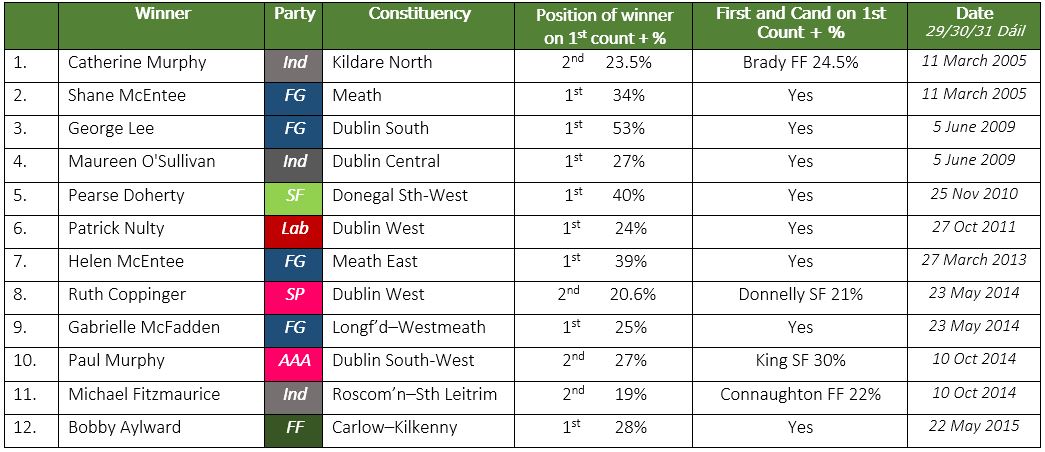 When looking at any of the by-elections you have to remember that in eight out of the past 12 by-elections* the winner was the one who topped the poll on the first count. In the other four, the eventual winner came second on the first count, but was sufficiently close to the poll topper to be able to pull ahead on transfers.